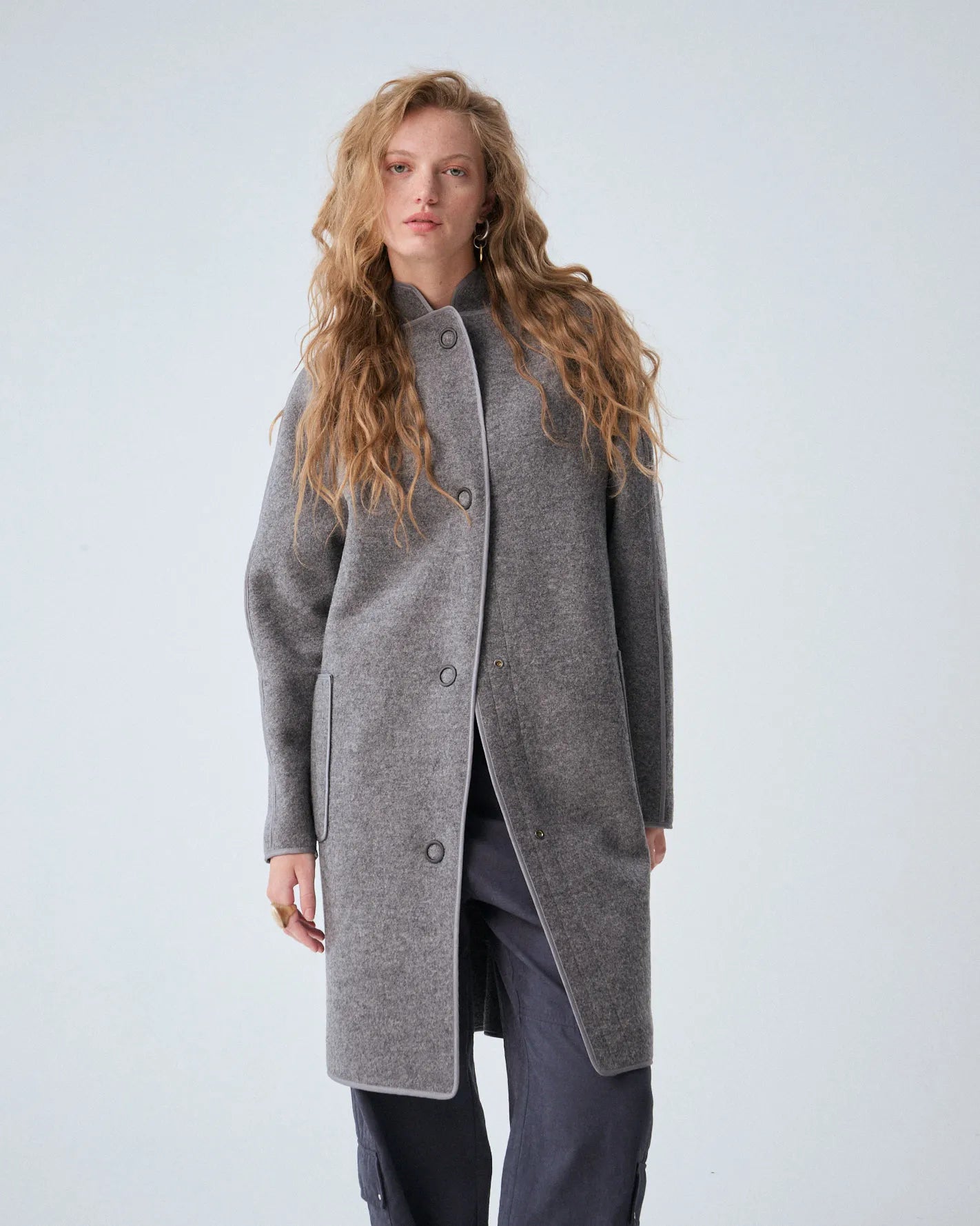 De silueta relajada y largo por debajo de la rodilla, tiene manga larga integrada al cuerpo, bolsillos plaqué en los laterales y cierre con broches metálicos en el frente.