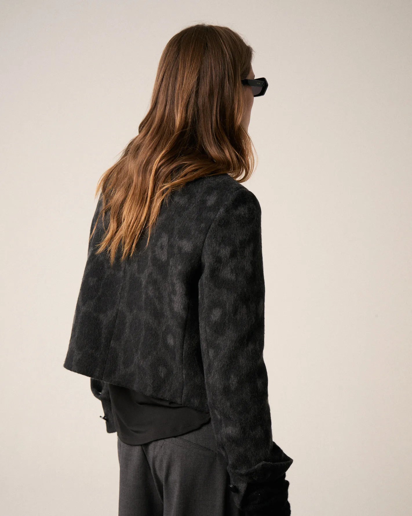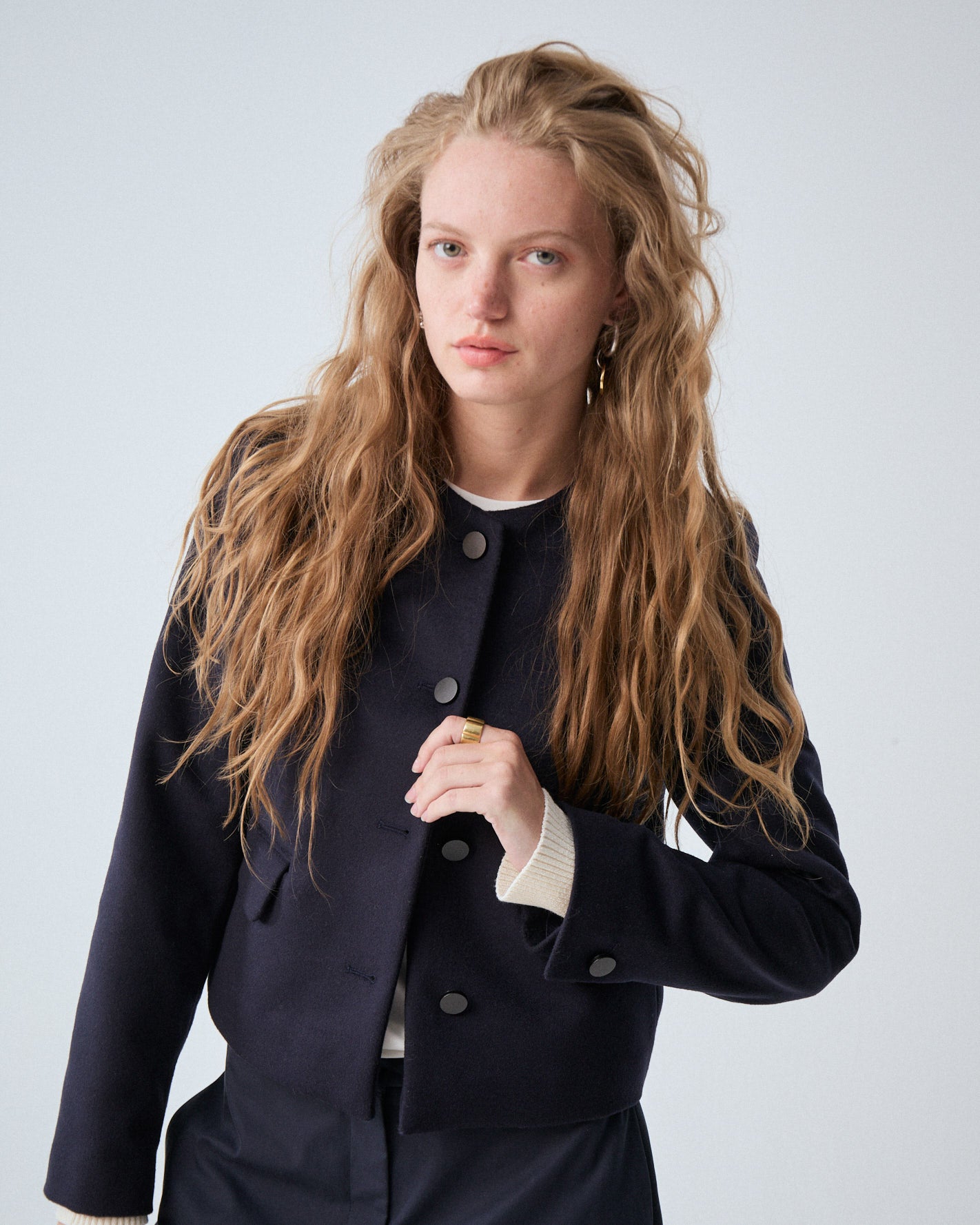 De fit entallado y largo a la cadera, tiene escote redondo a la base, manga larga y cierre con botones negro mate y dorado en el frente, bolsillos ojal con tapa en los laterales.