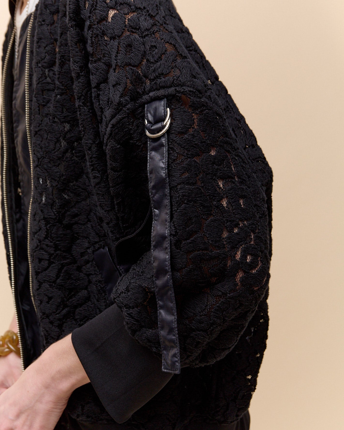 Confeccionada en encaje de algodón italiano, tiene cuello a la base en lycra, cierre metálico al frente, bolsillos laterales con broches, mangas 3/4 con recortes y puños combinados. Tiene tiras de ajuste con herrajes níquel y, en la espalda, recorte central con cierre metálico.