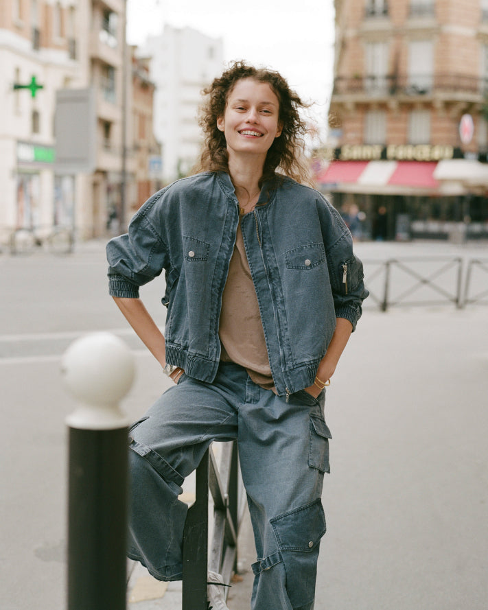 Chaqueta confeccionada en gabardina gastada de lino y algodón. Silueta bomber holgada con hombro caído y largo crop. Las mangas tienen unos recortes que van desde la sisa hasta el puño elastizado, una de las mangas tienen un bolsillo plaqué con cierre metálico en boca. El cuerpo tiene un cierre metálico en el acceso delantero, con bolsillos fantasía a cada lado en el pecho. Tiene unos recortes diagonales desde los que salen los bolsillos laterales, así como unos tiras con hebillas metálicas.