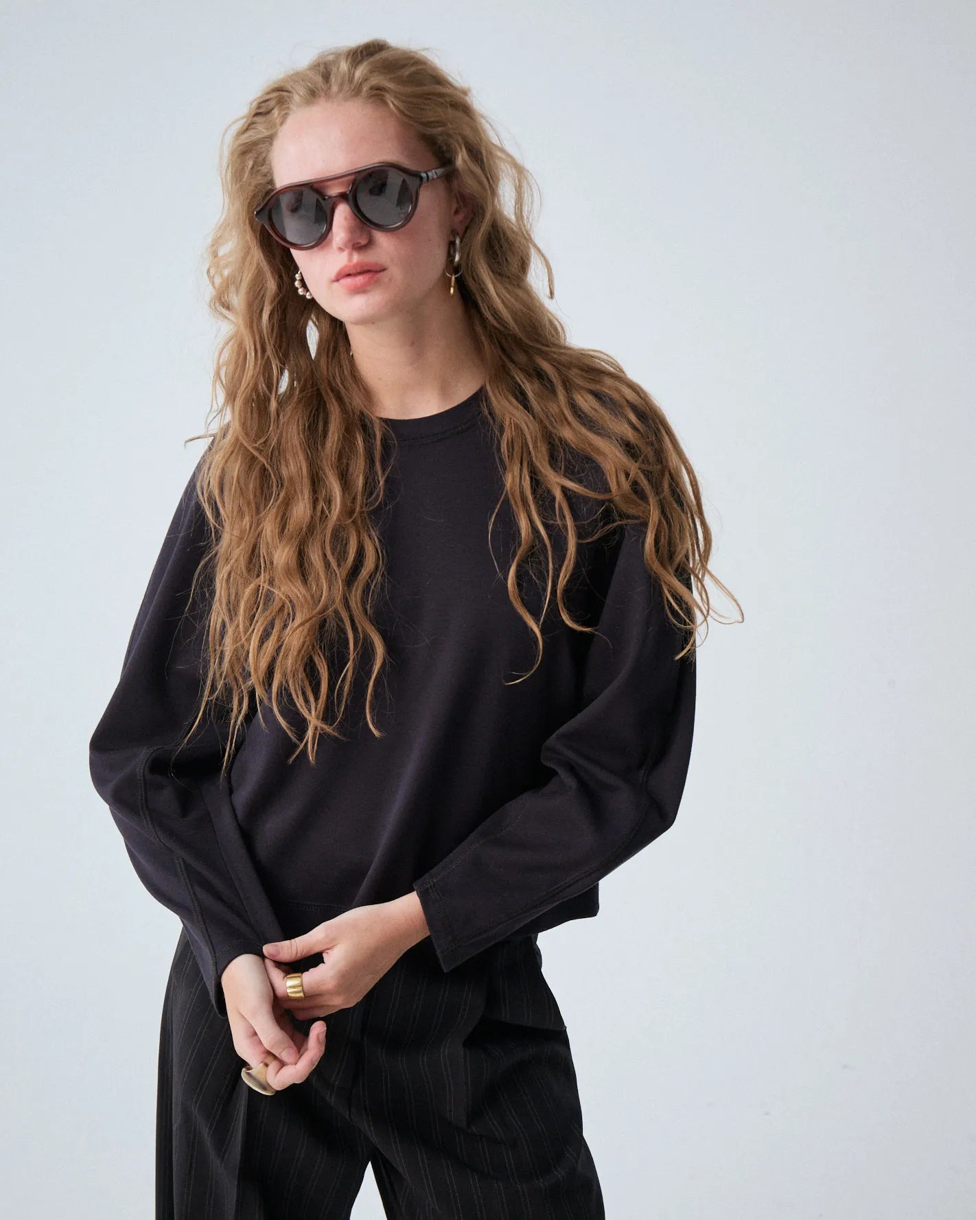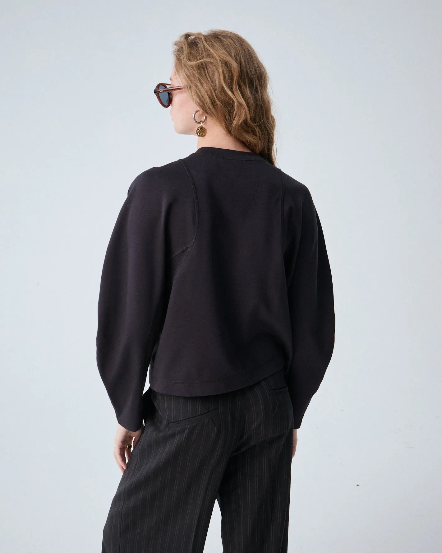 Buzo confeccionado en punto tramado italiano, con mangas voluminosas que le dan un toque único y original.