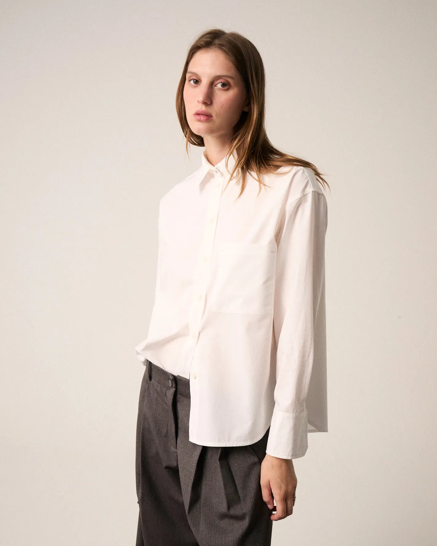 Cuello camisero, cartera con botones, bolsillo plaqué y mangas largas con pliegues en los puños.