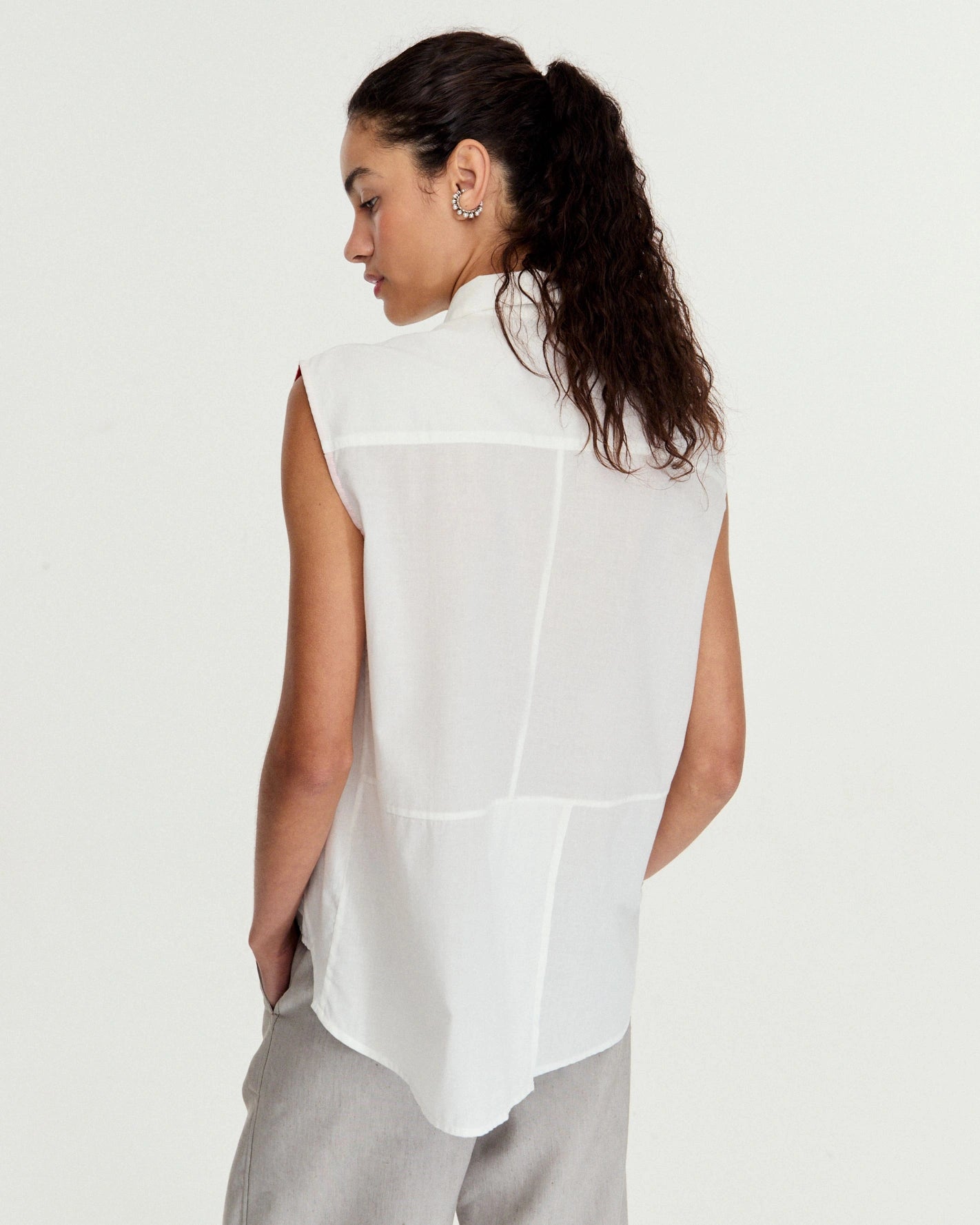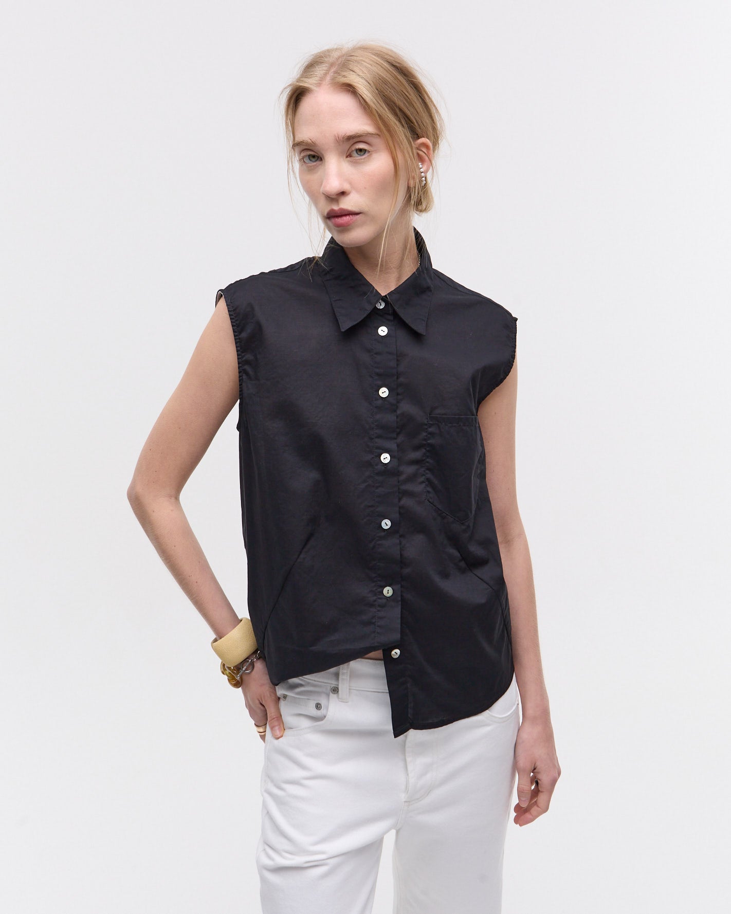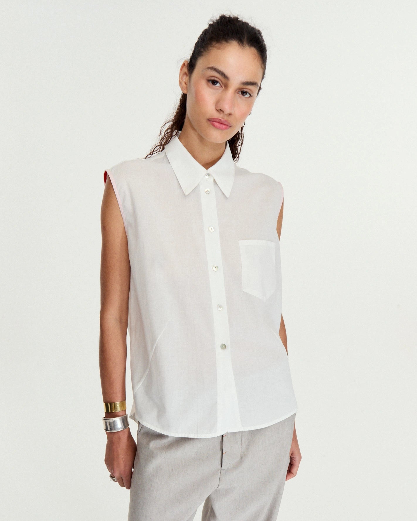 Camisa sin mangas en voile de algodón liviano y fresco, ideal para alto verano. Tiene fit relajado, cuello camisero, cartera con botones de nacar y un bolsillo plaqué en delantero. Las sisas están envivadas internamente con una tela contratono. Tiene costura en centro espalda y recorte en cintura trasera con tajo que se superpone.