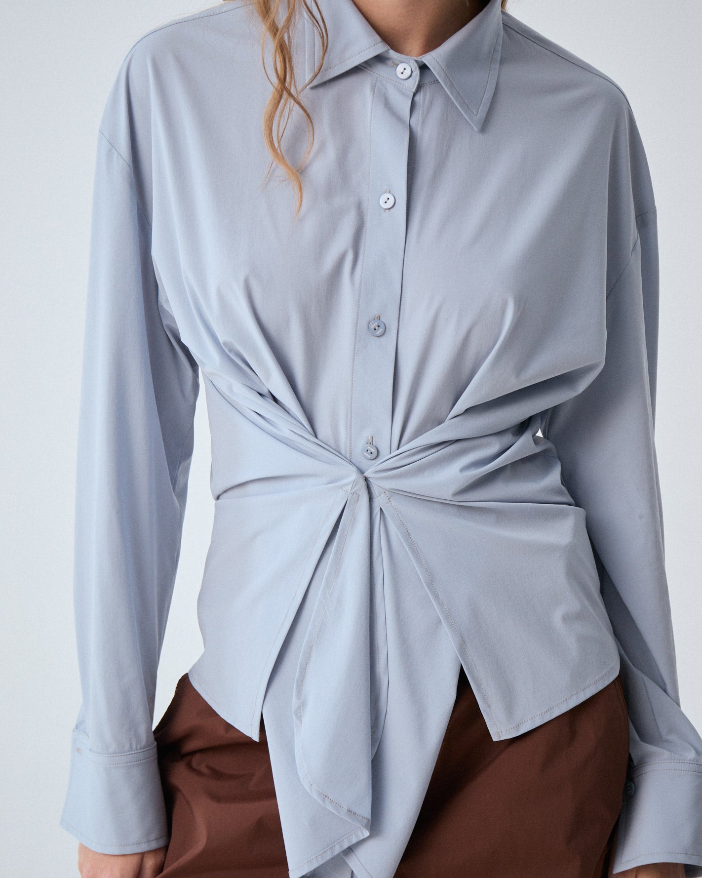 Tiene cuello camisero, cartera con botones y recortes en el delantero que, al unirse con botones y ojales, crean un efecto drapeado único.