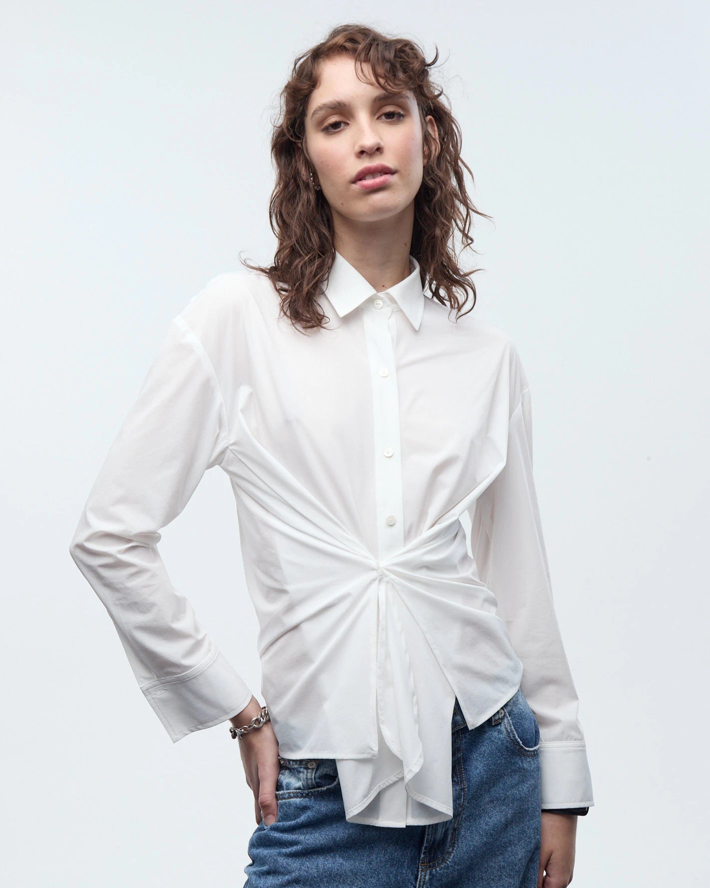 Camisa en poplin tec con elastano, de fit relajado y hombro caído.