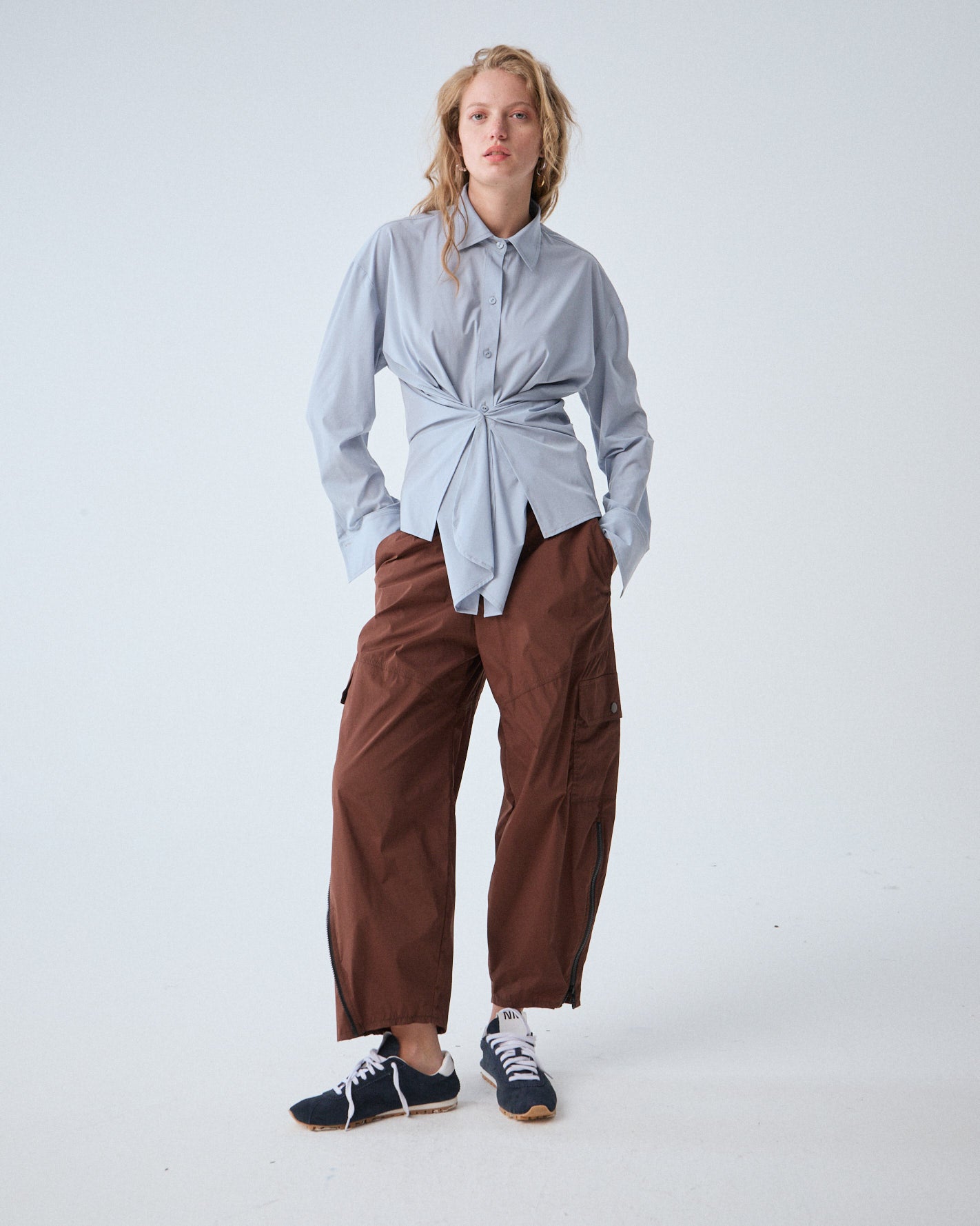 Mangas largas con pliegues en los puños, y tablas en espalda que aportan movimiento y estructura a la prenda.