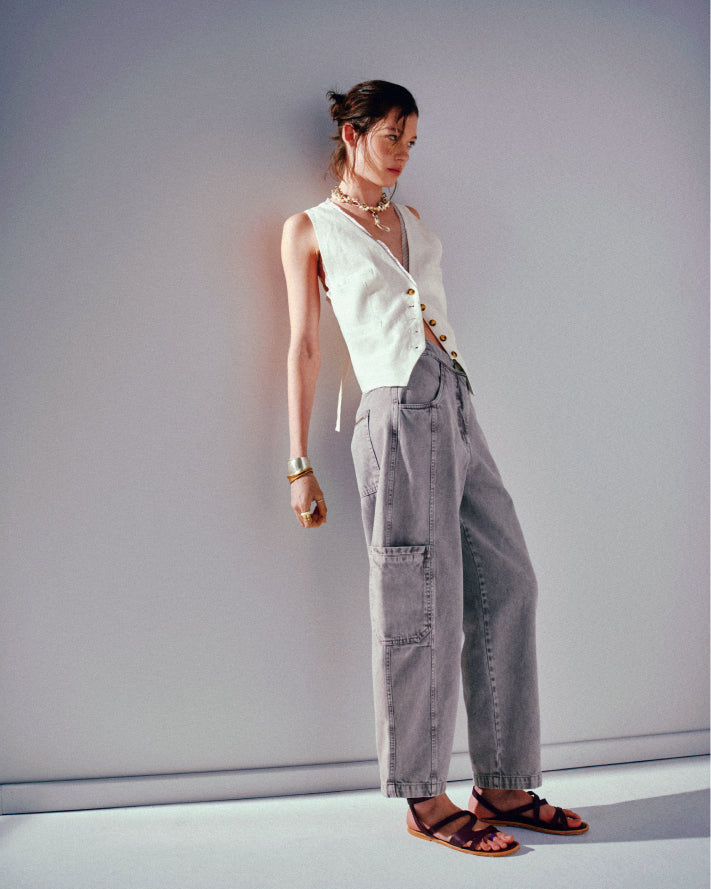 Chaleco sastrero en 100% lino italiano. Tiene un fit relajado y escote en V profundo. Recortes en tela combinada tanto en delantero como en sisa y ruedo.