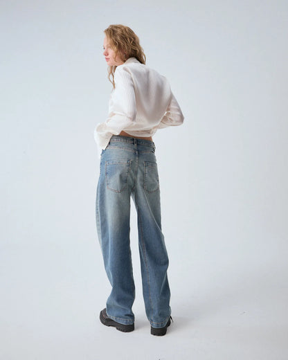 Jean recto, tiro medio, con fit relajado y largo hasta el talón.
