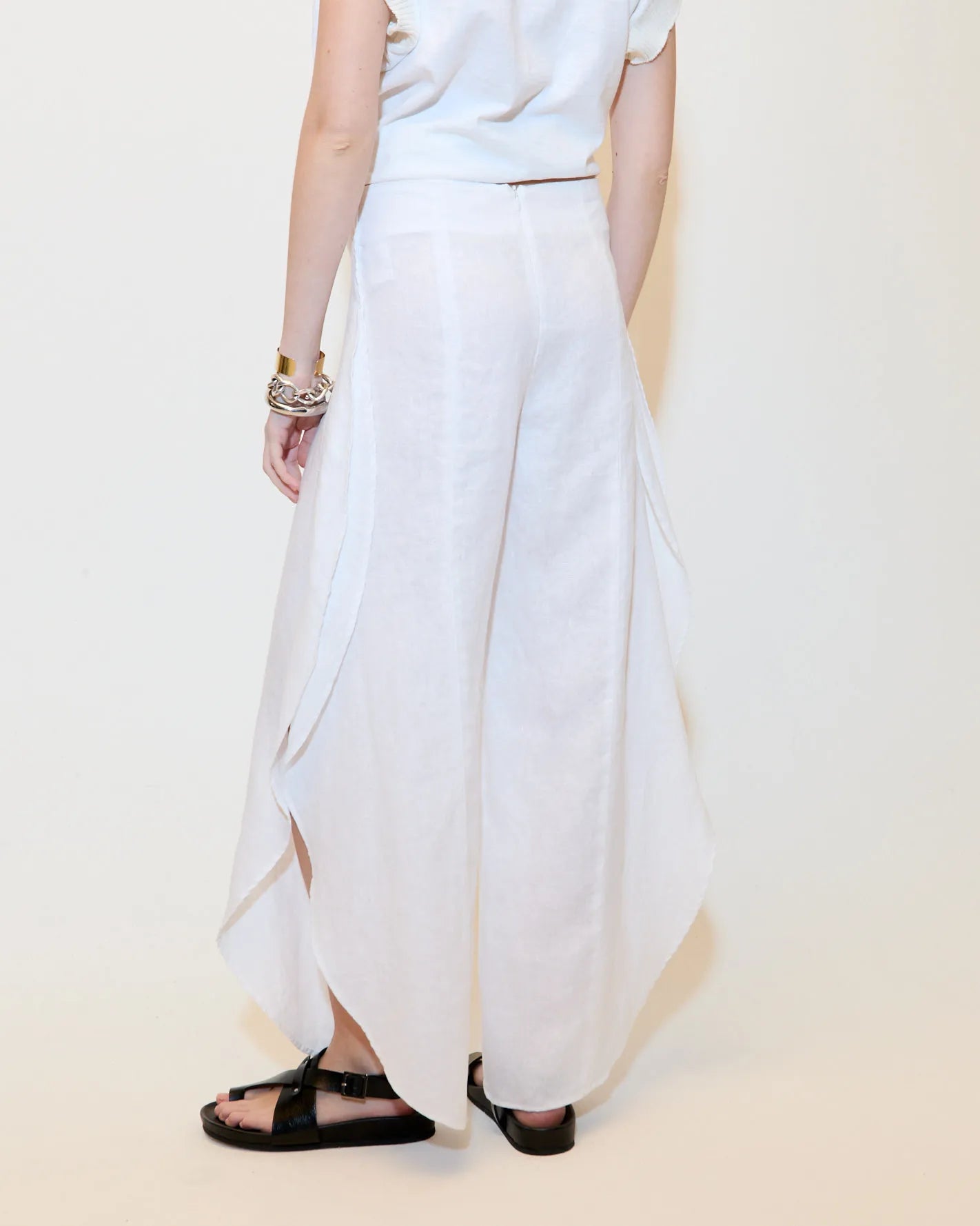 Pantalón con silueta súper moderna confeccionado en linos delavé que gastan con el lavado. Su silueta circular le da movimiento y caída.