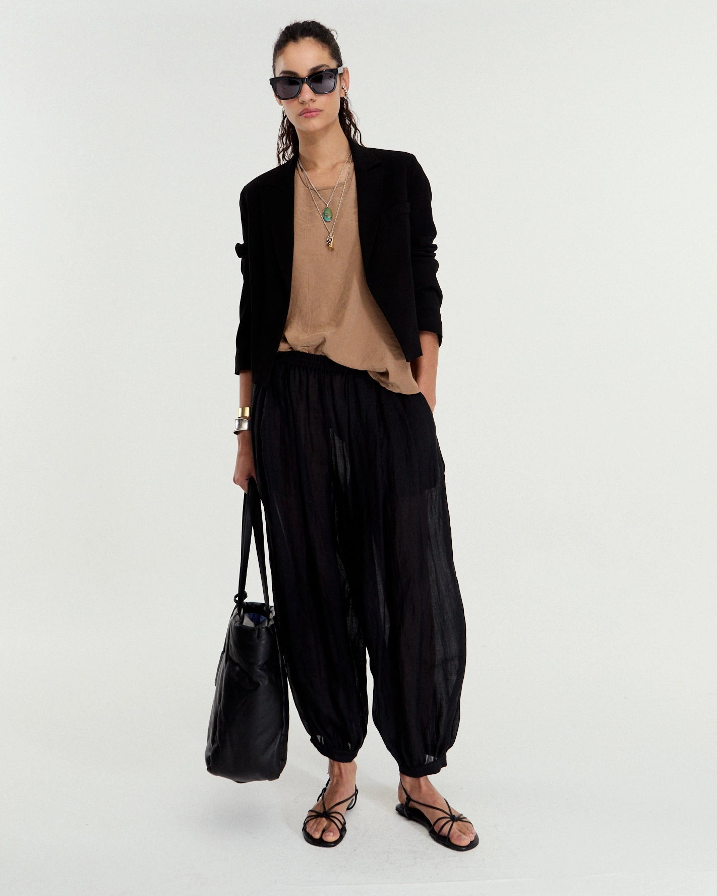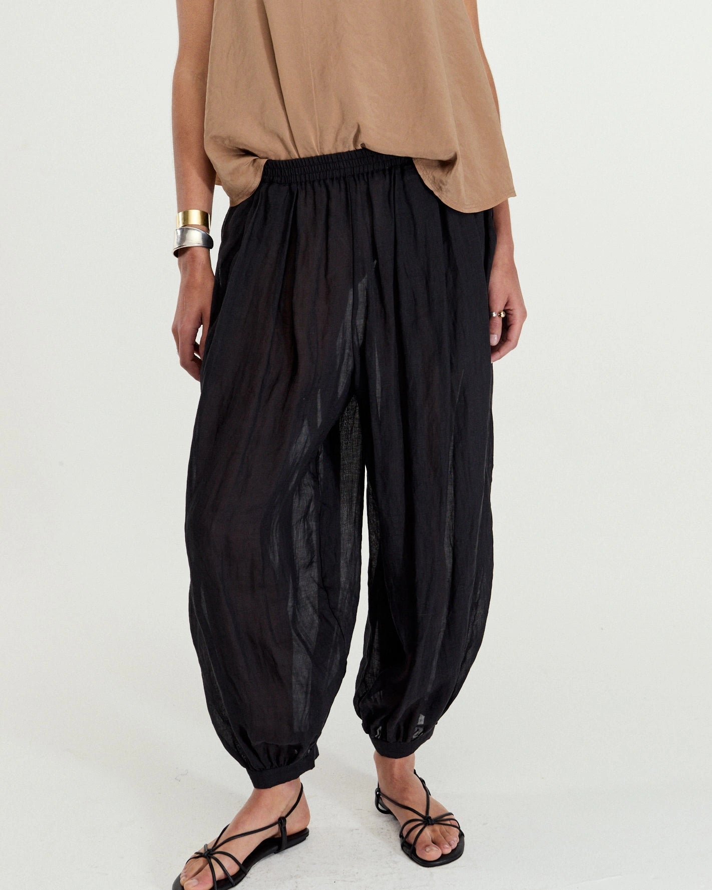 Babucha confeccionada en 100% ramio con silueta super amplia y cintura elastizada. Tiene bolsillos en laterales y tablas y frunces en la cintura para dar mas volumen a la prenda, la pierna termina con un puño. Está forrada en voile de algodón para evitar transparencia. Es tiro medio y larga hasta el tobillo.