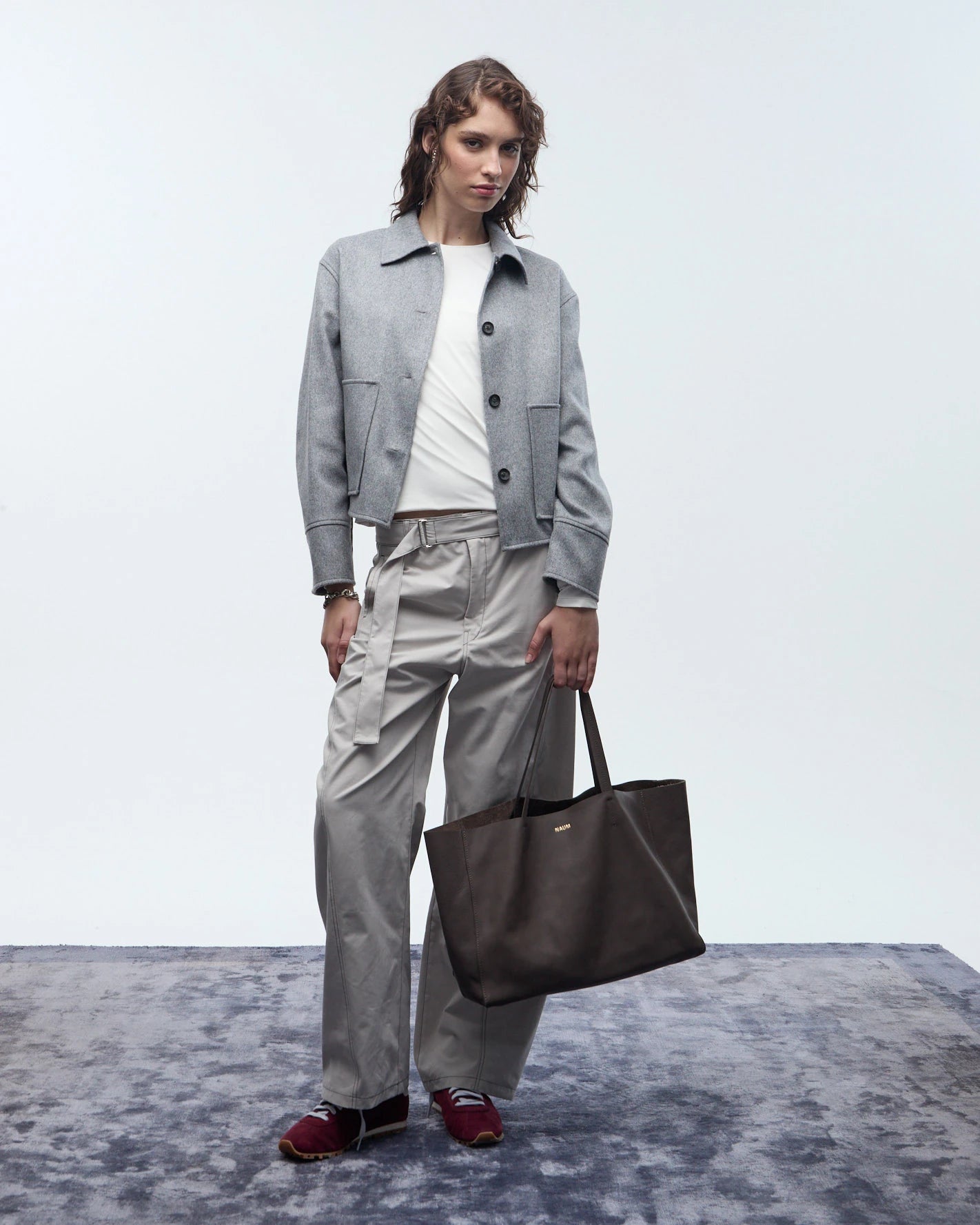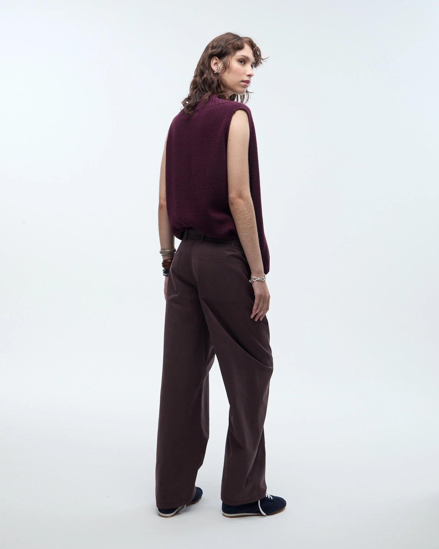 Pantalón confeccionado en gabardina peach. Las costuras laterales están adelantadas, de las cuales salen bolsillos a cada lado, hay un par de bolsillos plaqué en espalda y un cinturón de la misma tela con herraje metálico níquel. Tiro medio, pierna recta y largo hasta tobillos