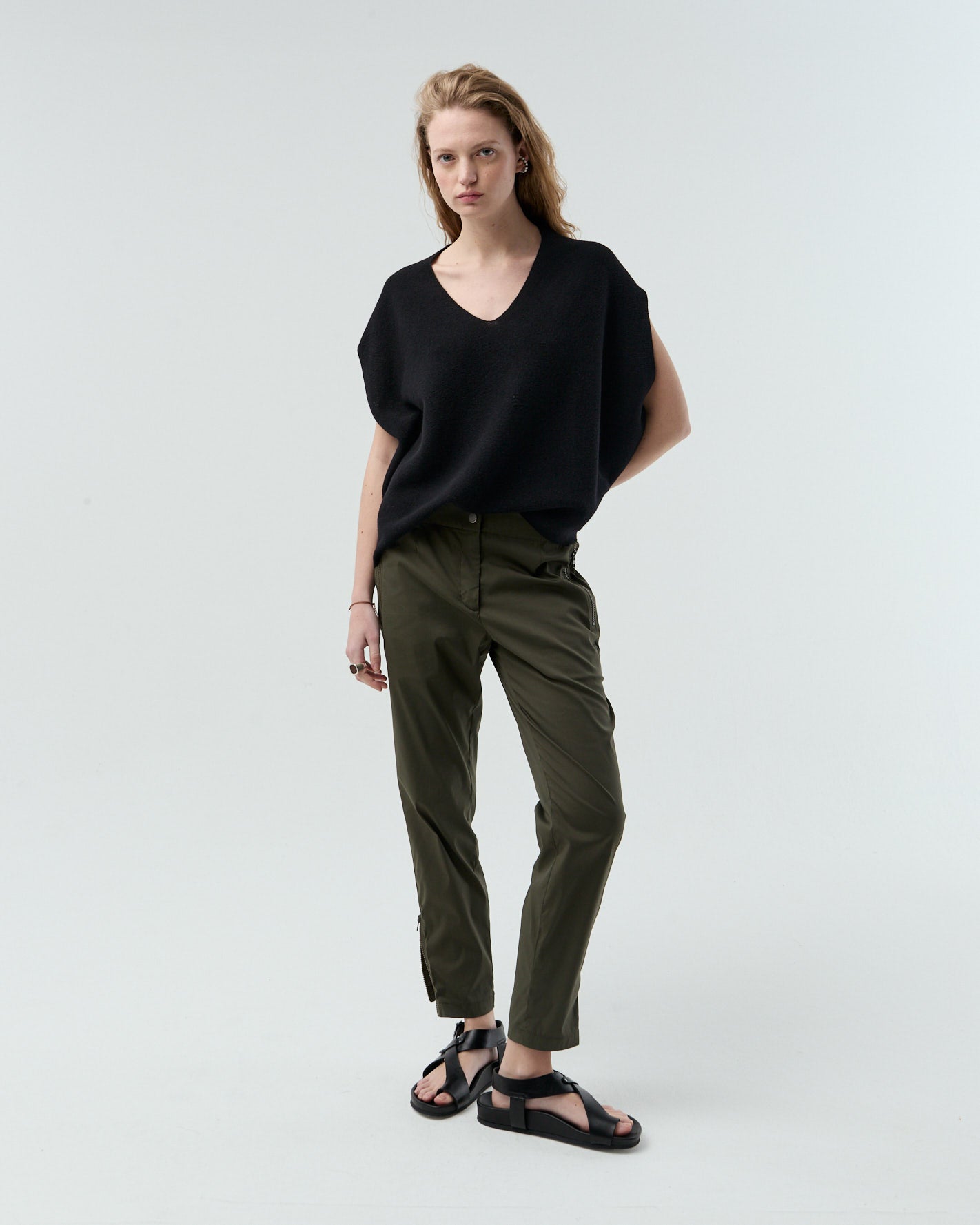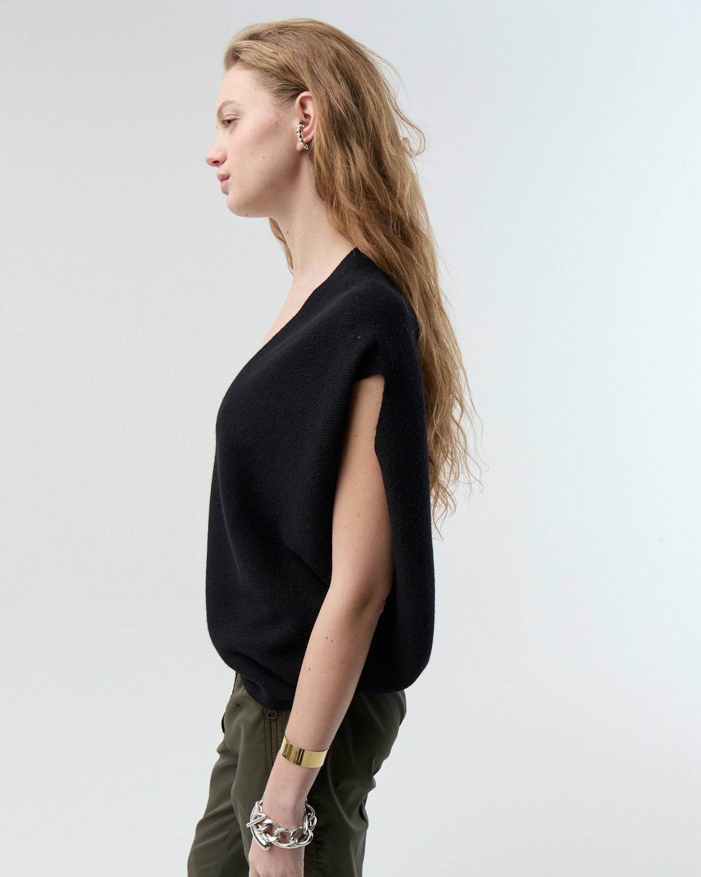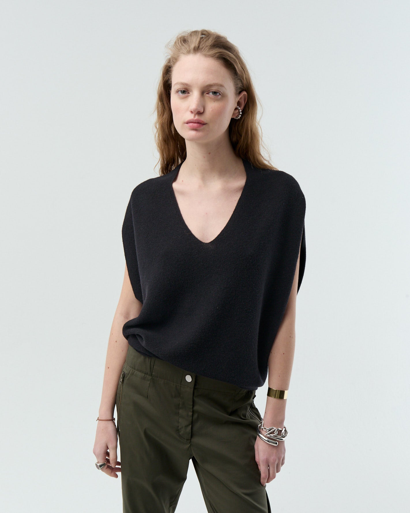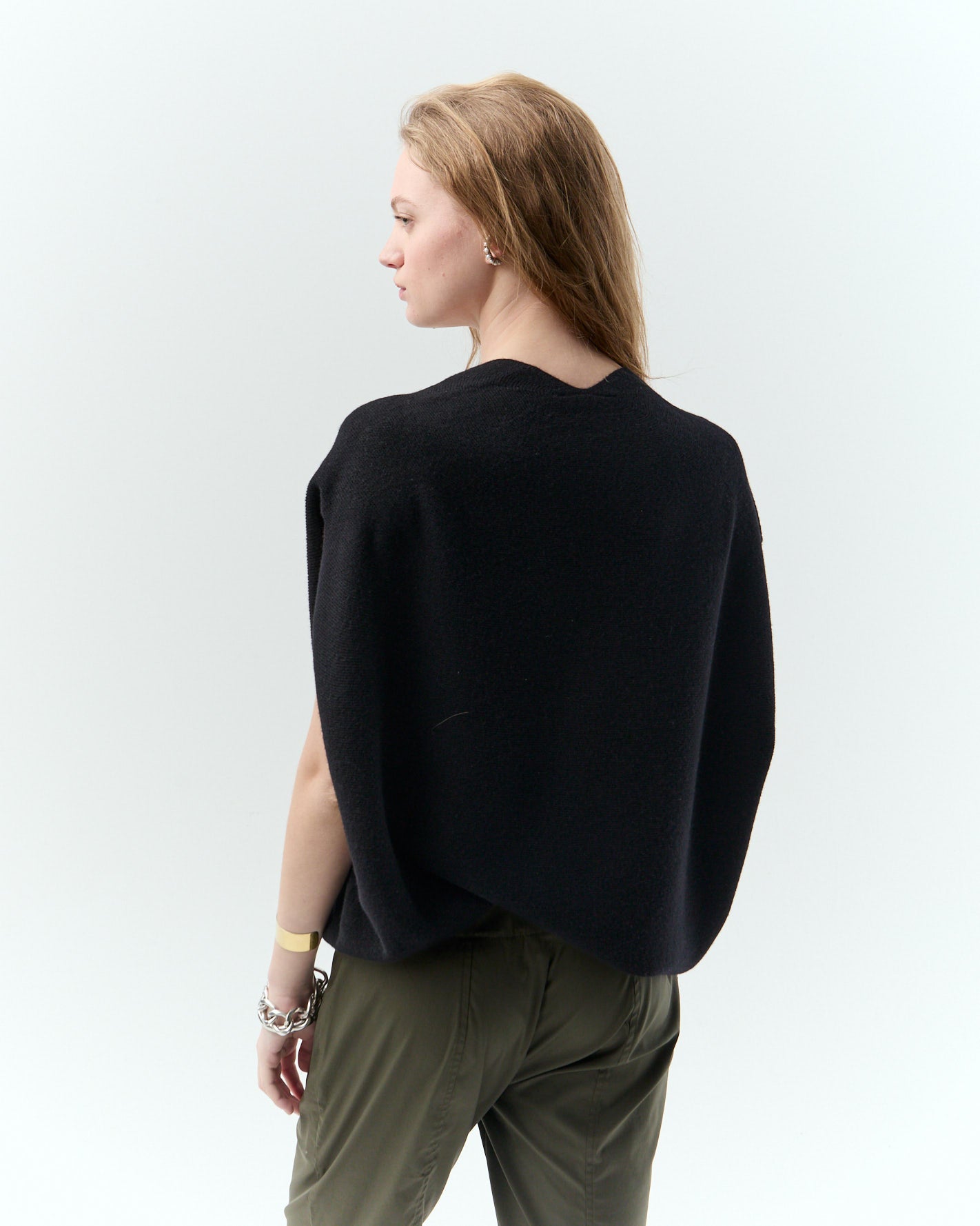 Ponchito tejido en un hilado suave y fino. Escote V, silueta relajada y largo hasta la cadera.