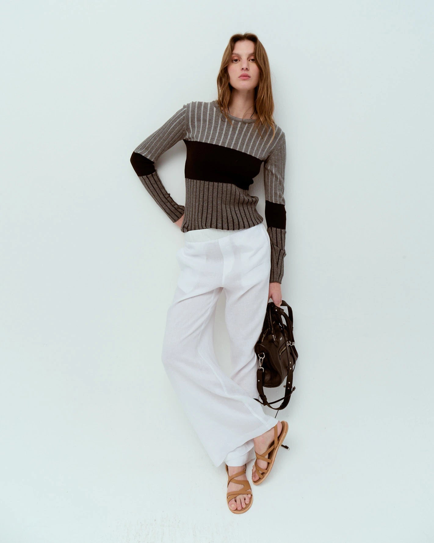Sweater en algodón y viscosa con tejido vanizado y efecto colorblock. Fit al cuerpo con manga larga pegada y escote redondo a la base. Largo por arriba de la cadera.