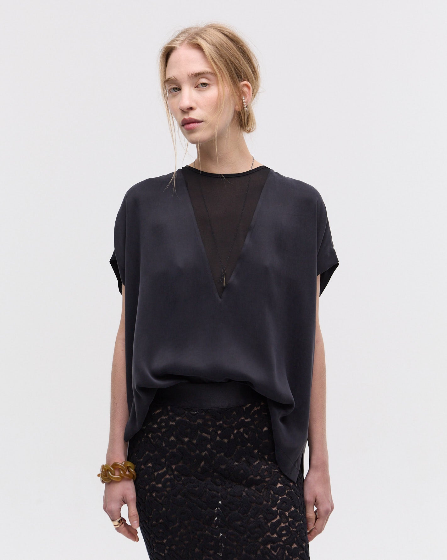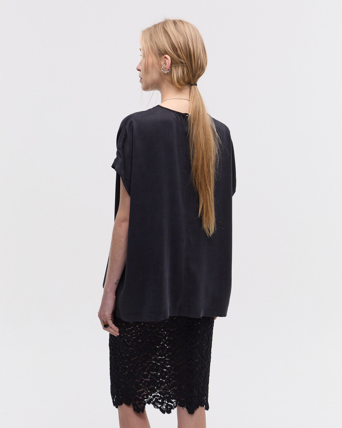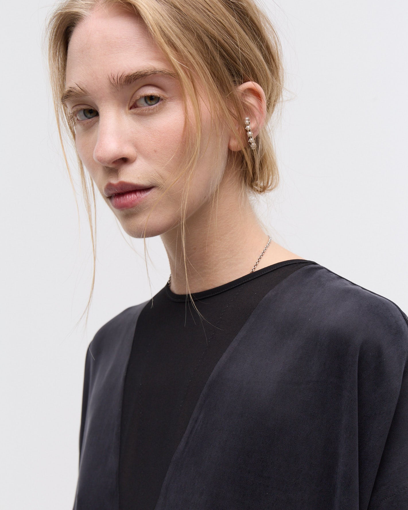 Confeccionado en cupro, es de fit relajado estilo caftán sin mangas. Tiene cuello bote con recorte en V en tela combinada, tajos laterales y espalda con costura central. Largo a la cadera.