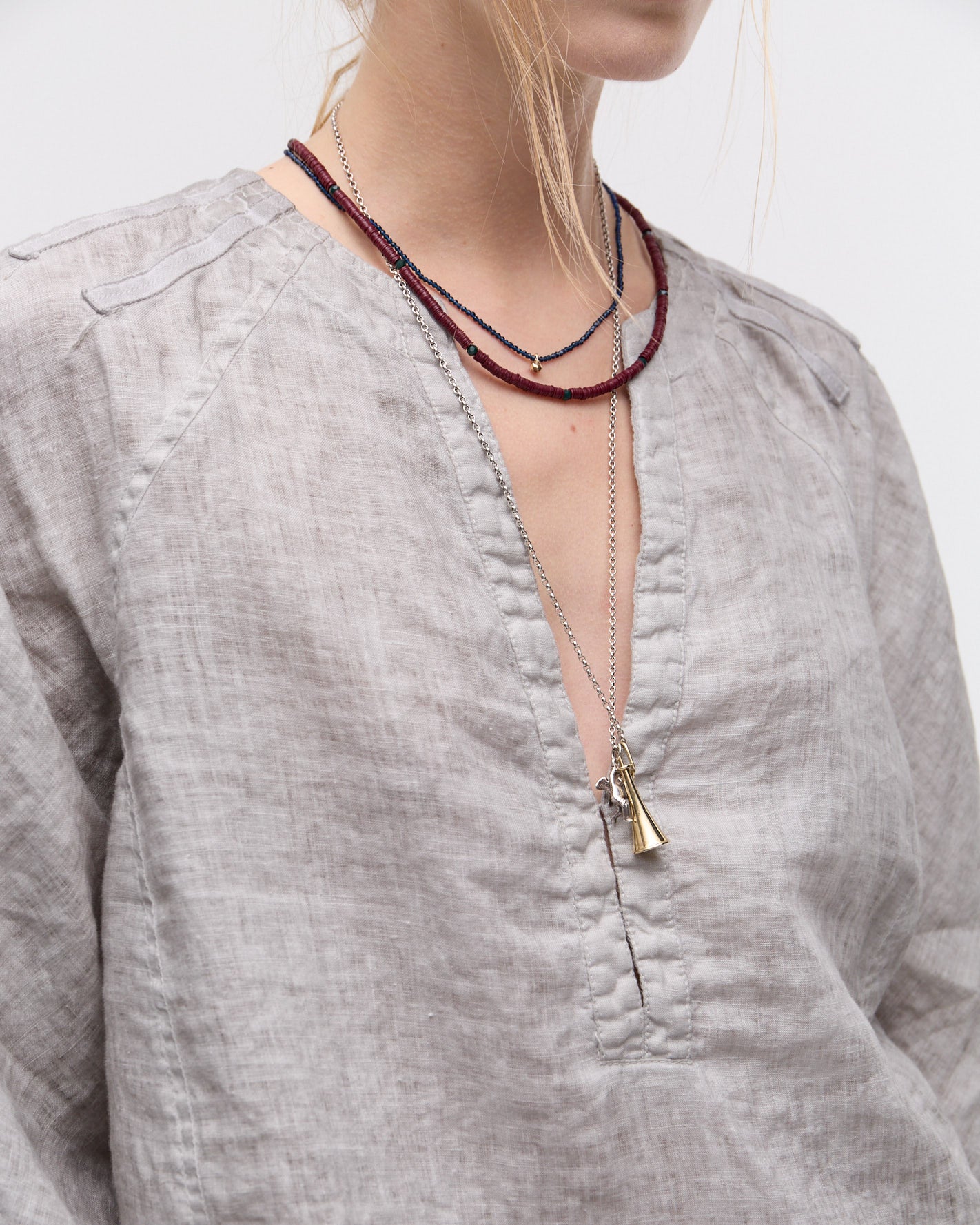 El top Emilia es un icónico de NAUM, está confeccionado en 100% lino. Tiene un calce relajado y línea A con cuello girocolo y cartera que se cierra mediante atraques. Tiene mangas ranglan anchas con pinzas externas que salen desde el escote. El ruedo está levemente escalonado, siendo más corto en delantero que en espalda. Tiene un lavado fade teñido en frío que genera un efecto melange.