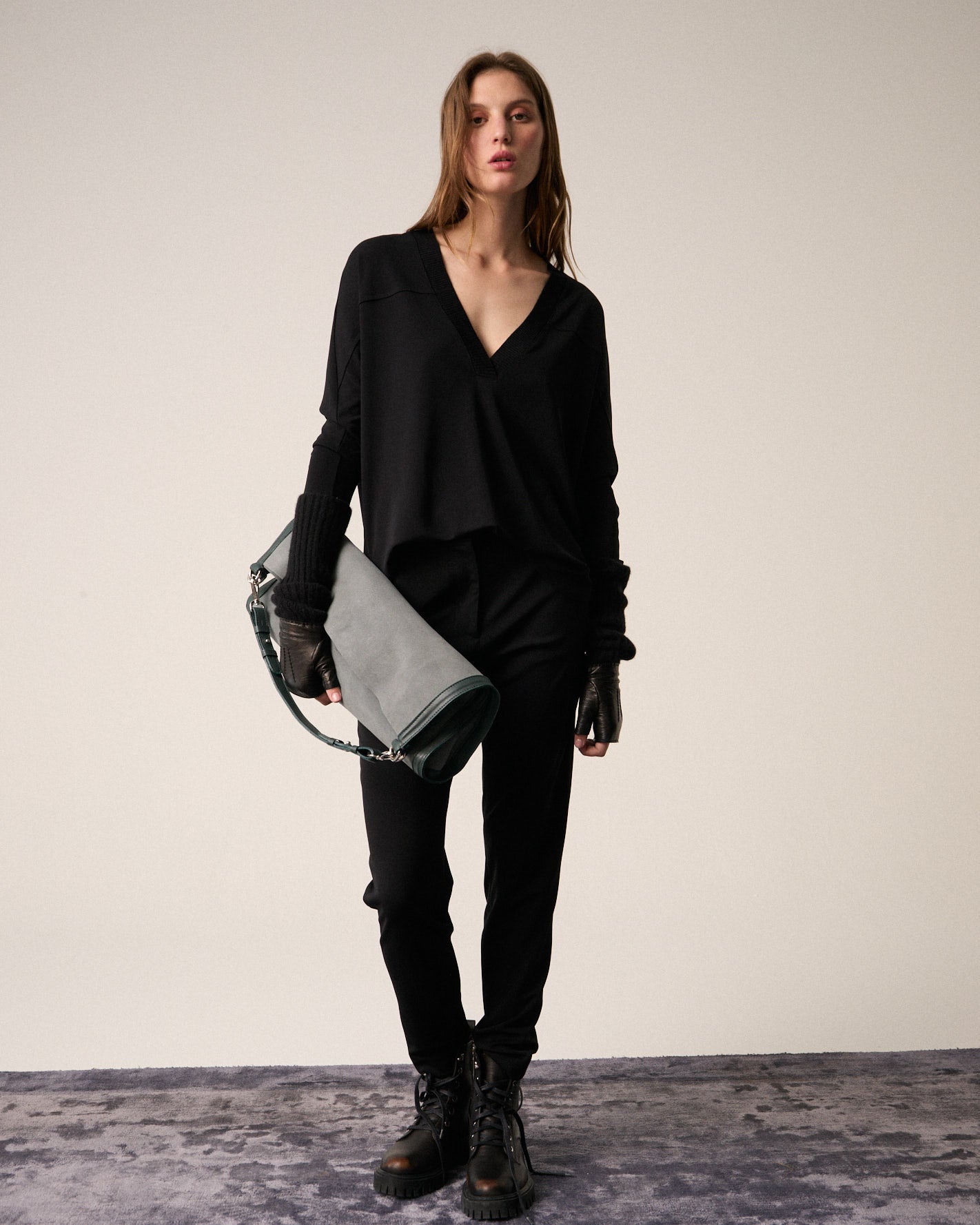 Top confeccionado en jersey líquido con escote en V y cuello tejido al tono de la tela, de silueta relajada y largo hasta la cadera.