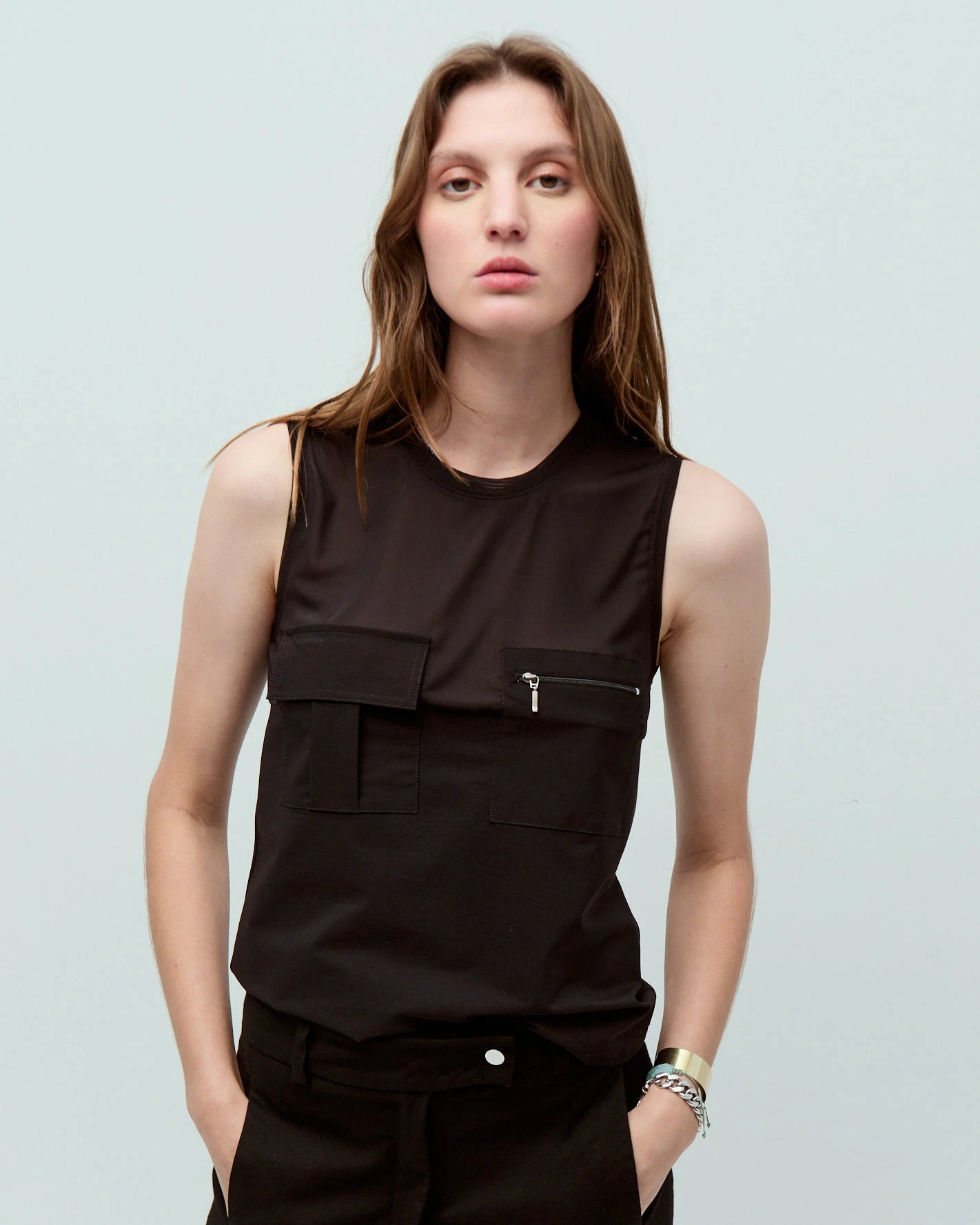 Top sin mangas confeccionado en poplin tech y microtul, de fit al cuerpo. Tiene cuello a la base, bolsillos plaqué en delantero, uno con tapa y el otro con un cierre. El recorte en centro delantero divide el tul del poplin tech.